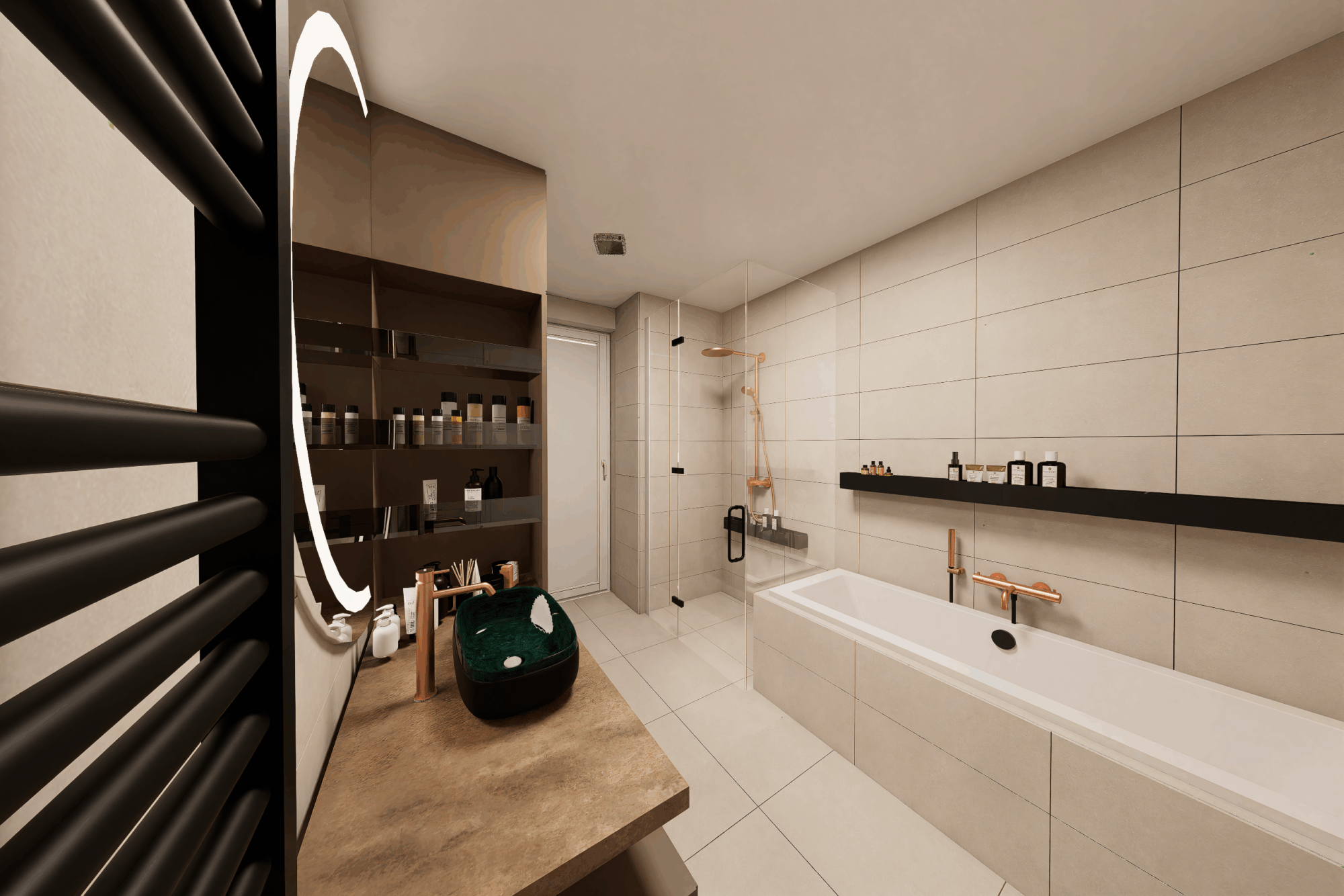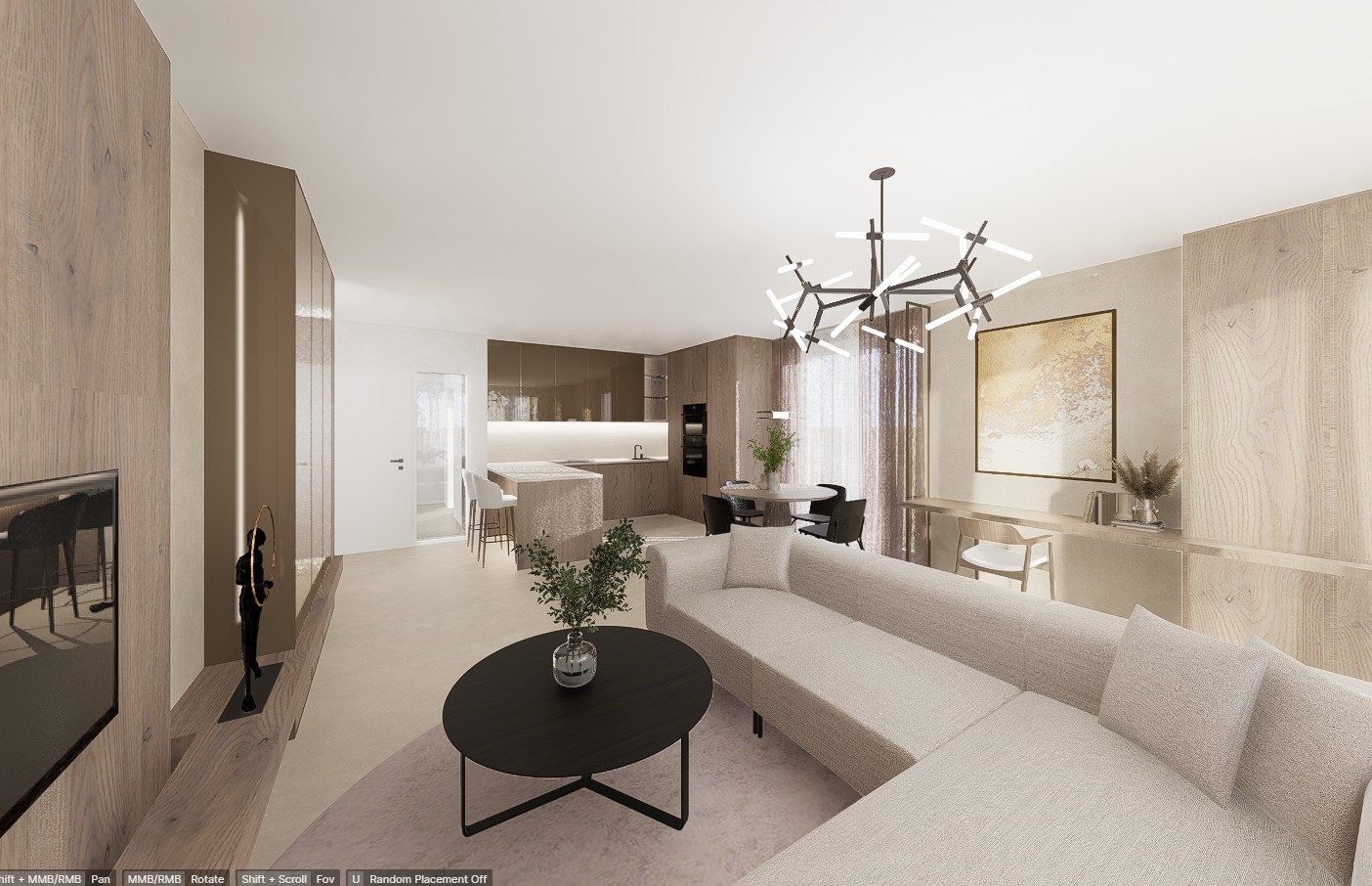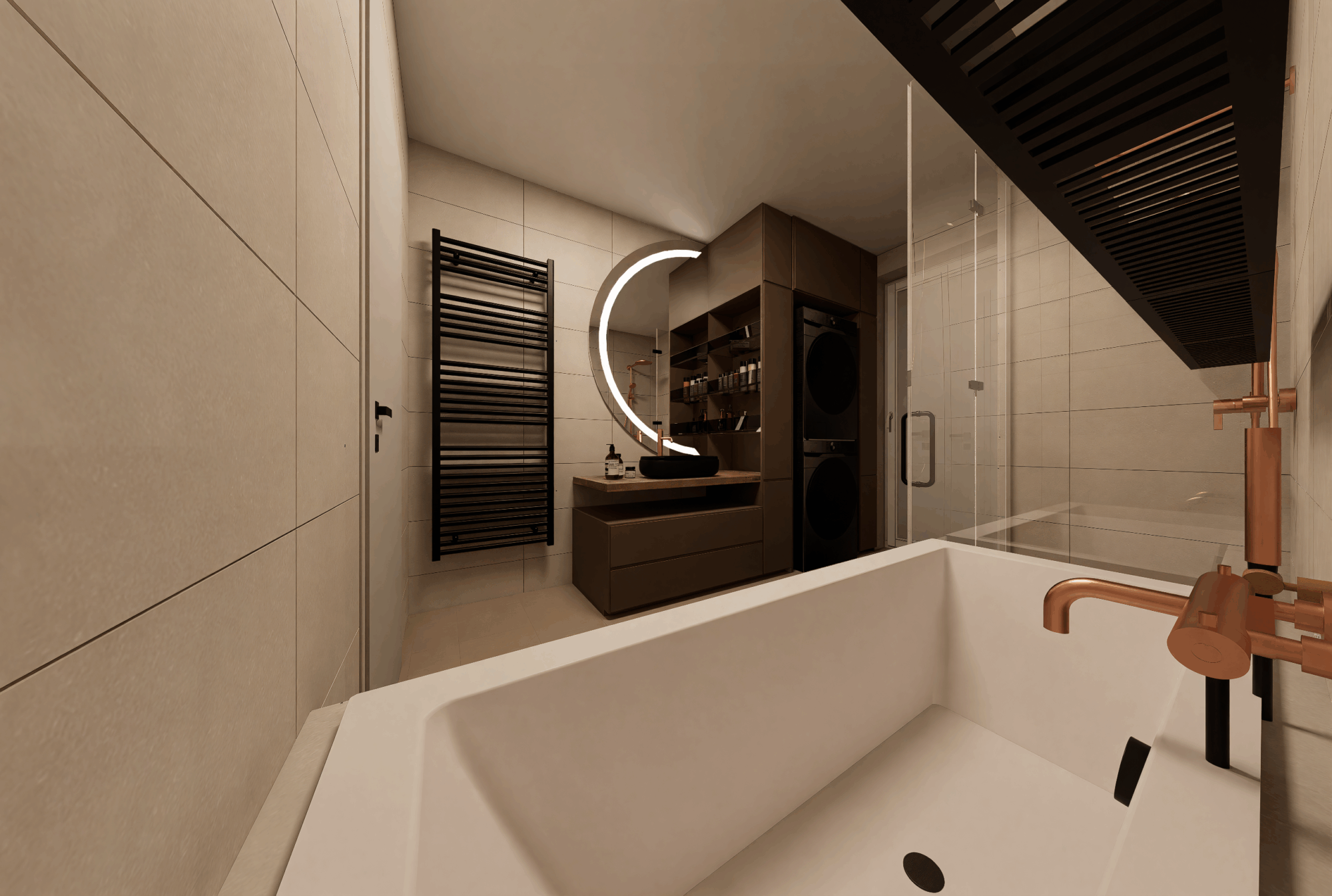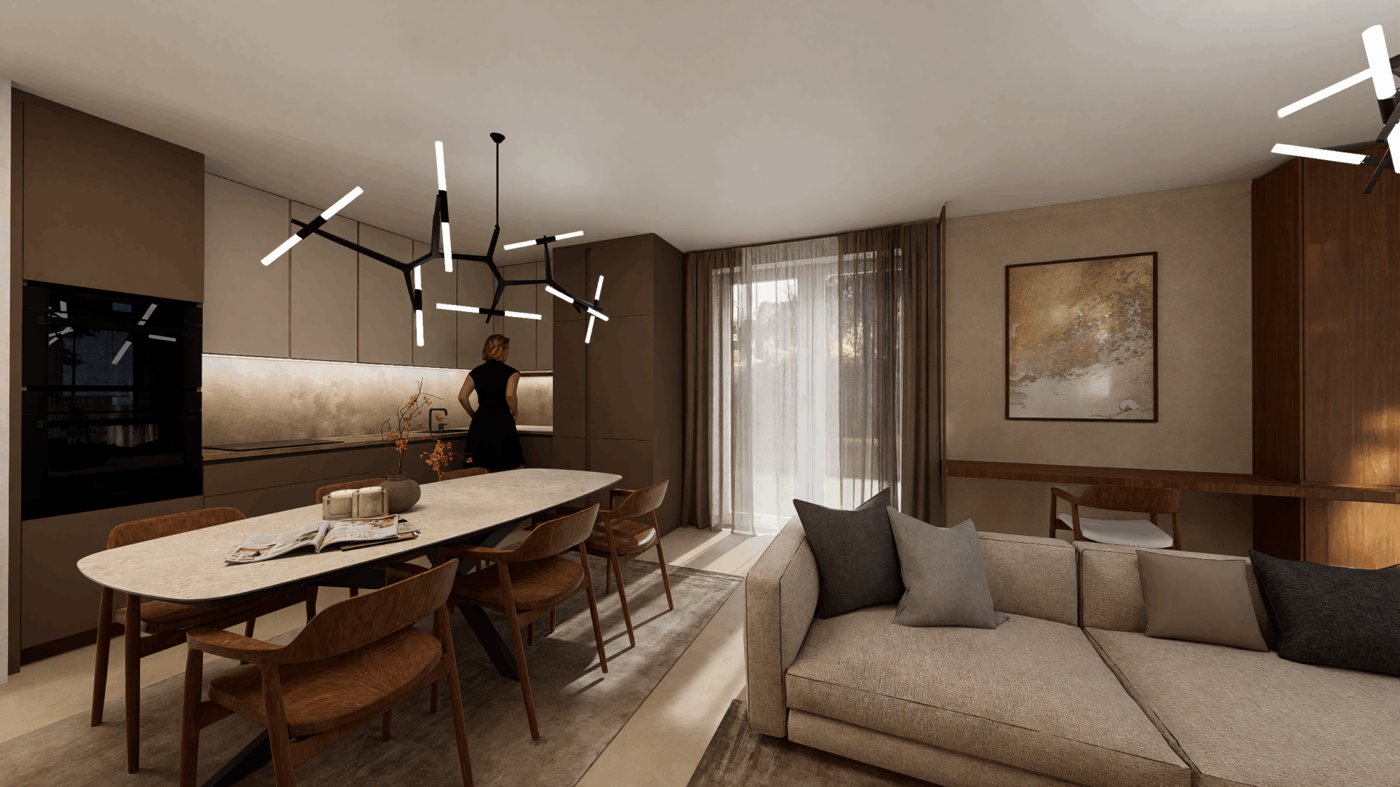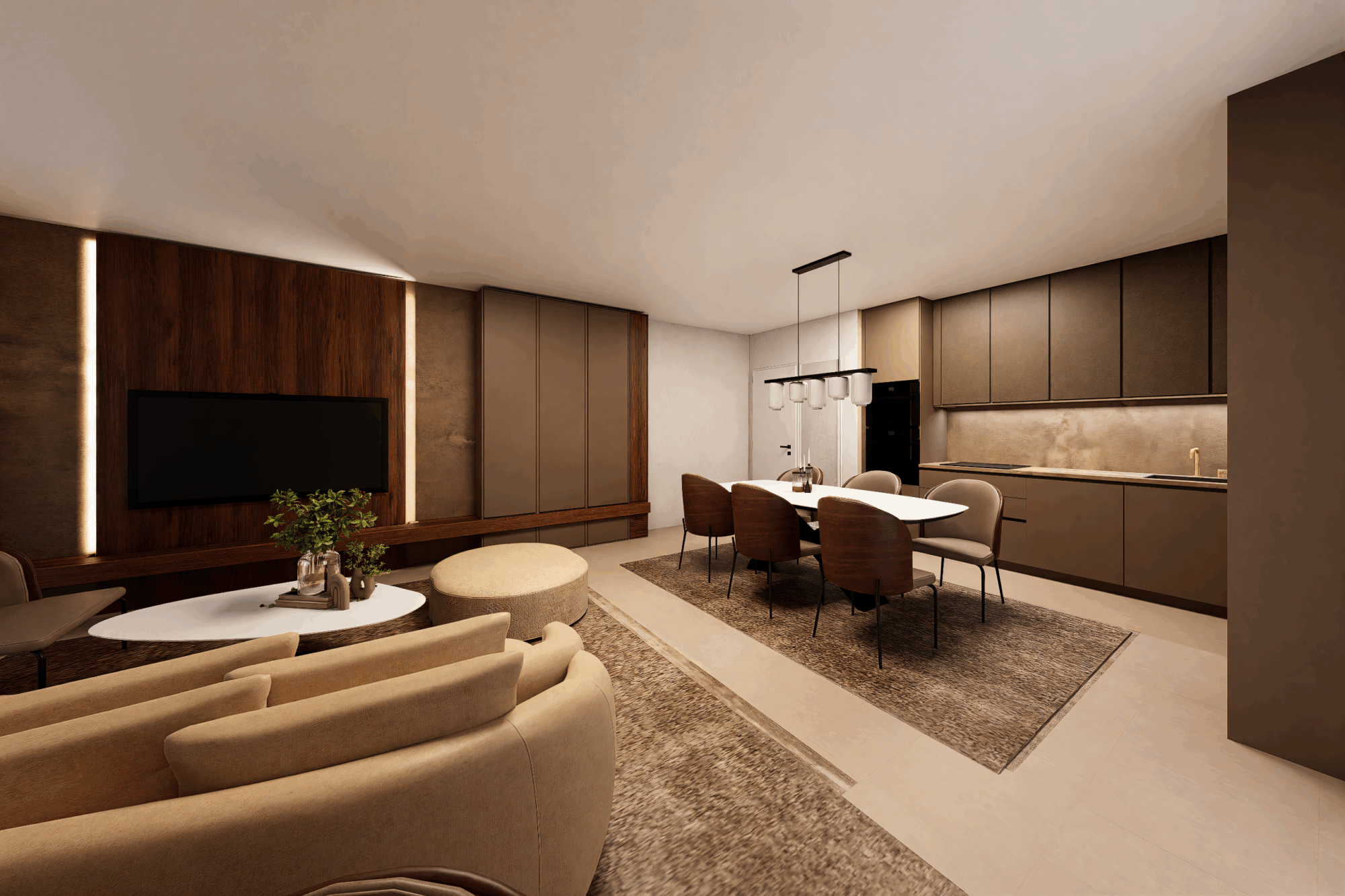 Celý interiér propojují teplé tóny dřeva, kávové odstíny a jemná světla, která neruší, ale ladí.