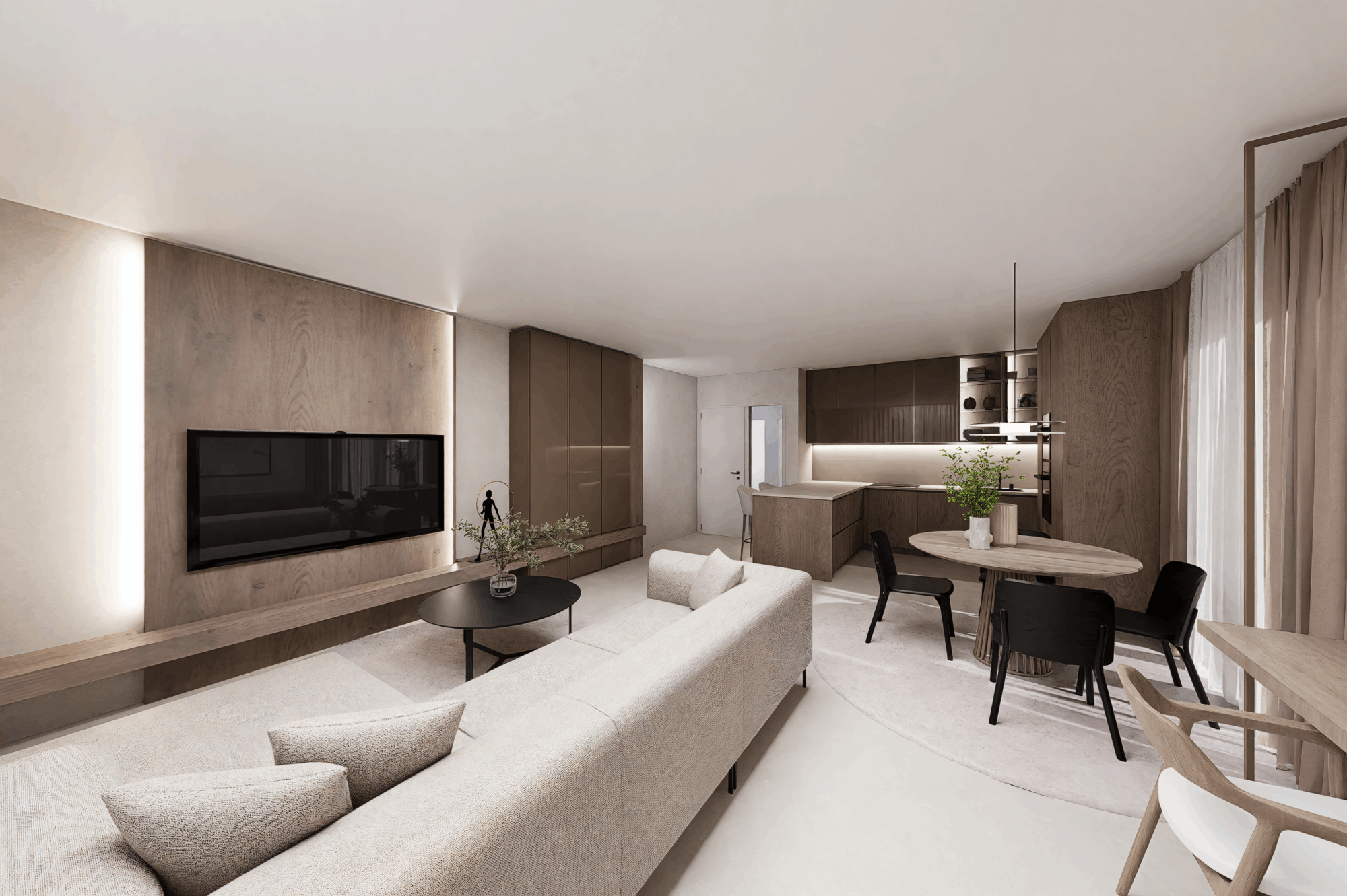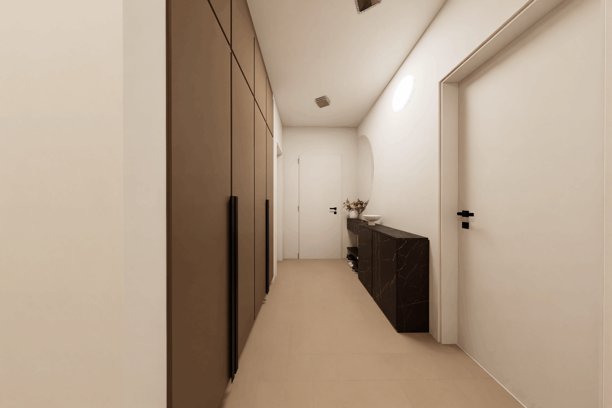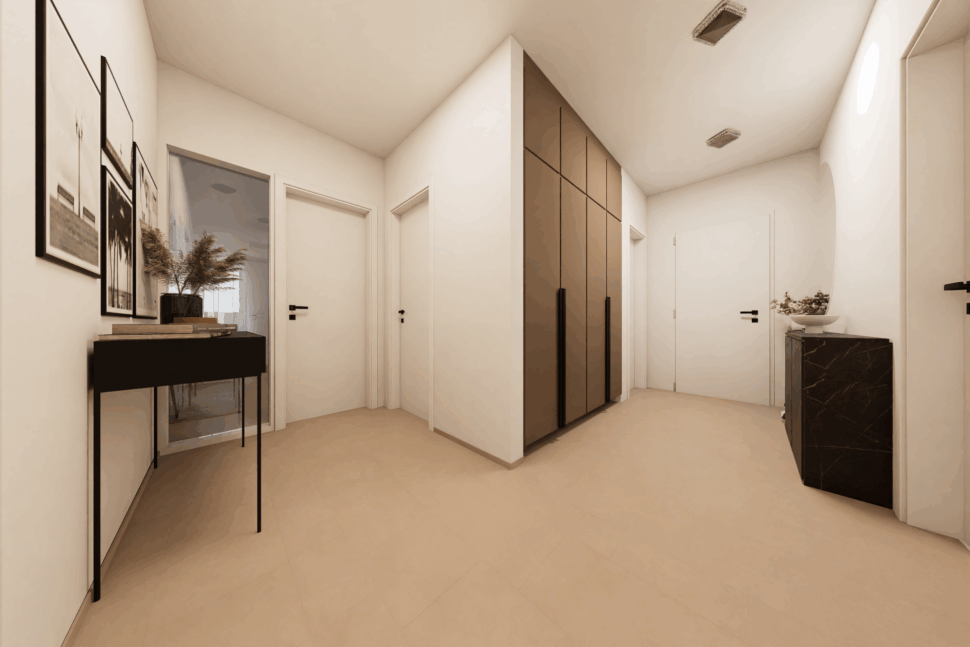 Tento interiér byl ve svém původním stavu spíš sterilní než inspirující. Byl to prostor bez osobnosti, který se vůbec nepotkával s vizí majitelů – dvou lidí, kteří pracují ve zdravotnictví, jsou každý den obklopeni nároky, světlem a sterilními prostory. A tak doma hledali pravý opak: klid, měkkost, přirozené materiály a útulné tmavší tóny, které uzemňují a dávají pocit bezpečí.