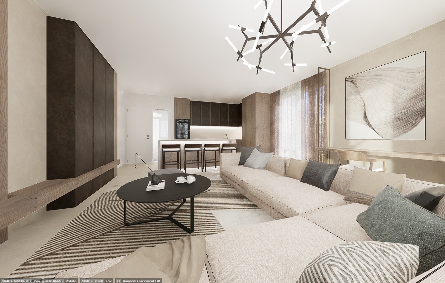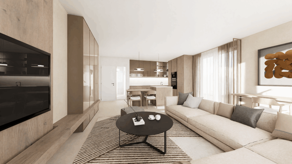 Obývací prostor získal nejen atmosféru, ale i wow-prvek v podobě půlkruhové pohovky, která se do běžných dispozic často nevejde – tady ale tvoří dominantní, měkké srdce celého bytu.